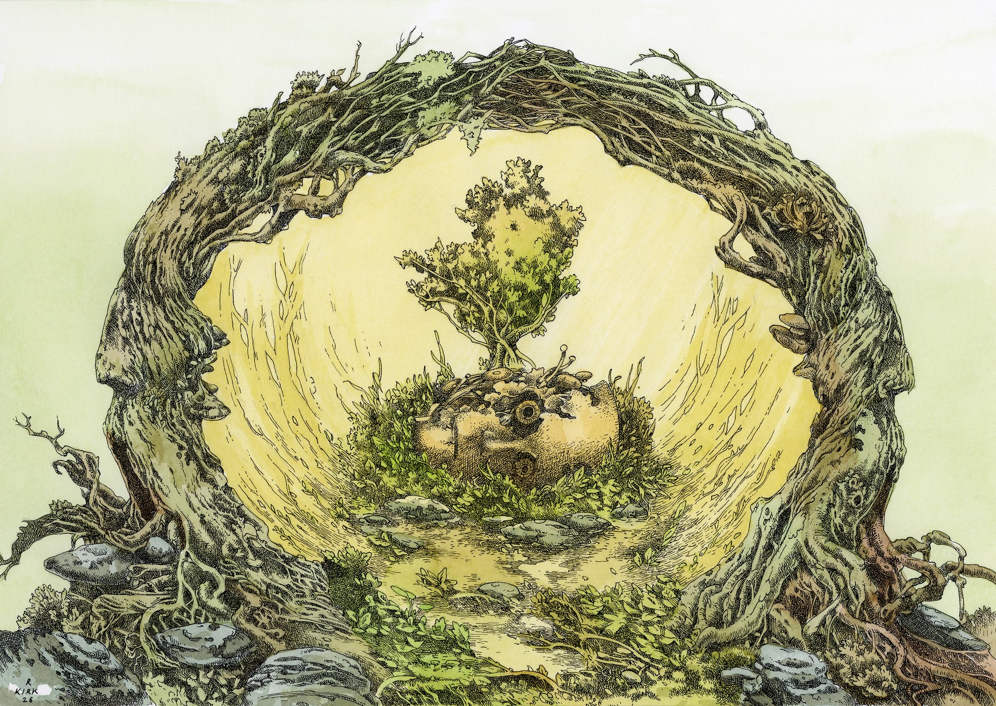 Original ink and watercolour painting by Richard A. Kirk, 2026, on hotpress paper, 10" x 14."