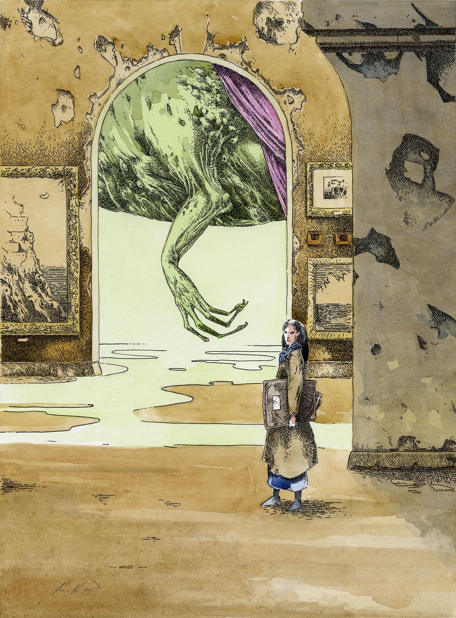 Original ink and watercolour painting by Richard A. Kirk, 2026, on artboard, 12" x 9."